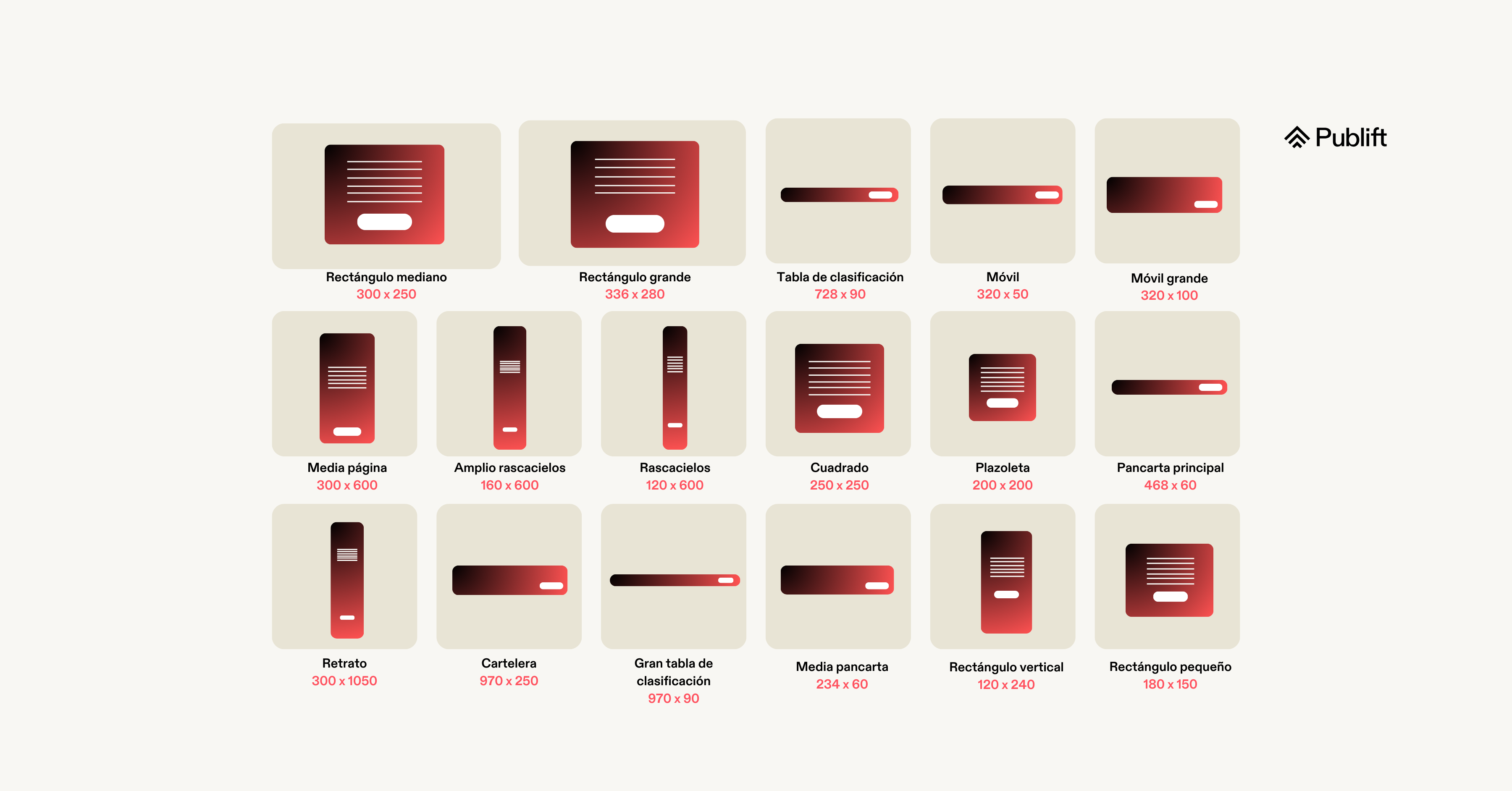 El tamaño de banner publicitario de 300 x 250 , también conocido como Rectángulo mediano, MRec, Unidad de página intermedia y MPU, se considera ampliamente el tamaño de banner publicitario más popular. Otros tamaños de anuncios populares son 468 x 60, que se popularizó durante la era de la navegación de baja resolución, y 320 x 50, una opción popular para dispositivos móviles.